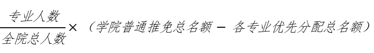 普通推免名额按照专业方向进行分配。根据学校当年发布的名额分配方案,先按学科、专业建设发展情况分配优先名额,再将剩余名额按各专业方向的有学籍在校人数比例根据实际情况进行分配,计算公式如下: