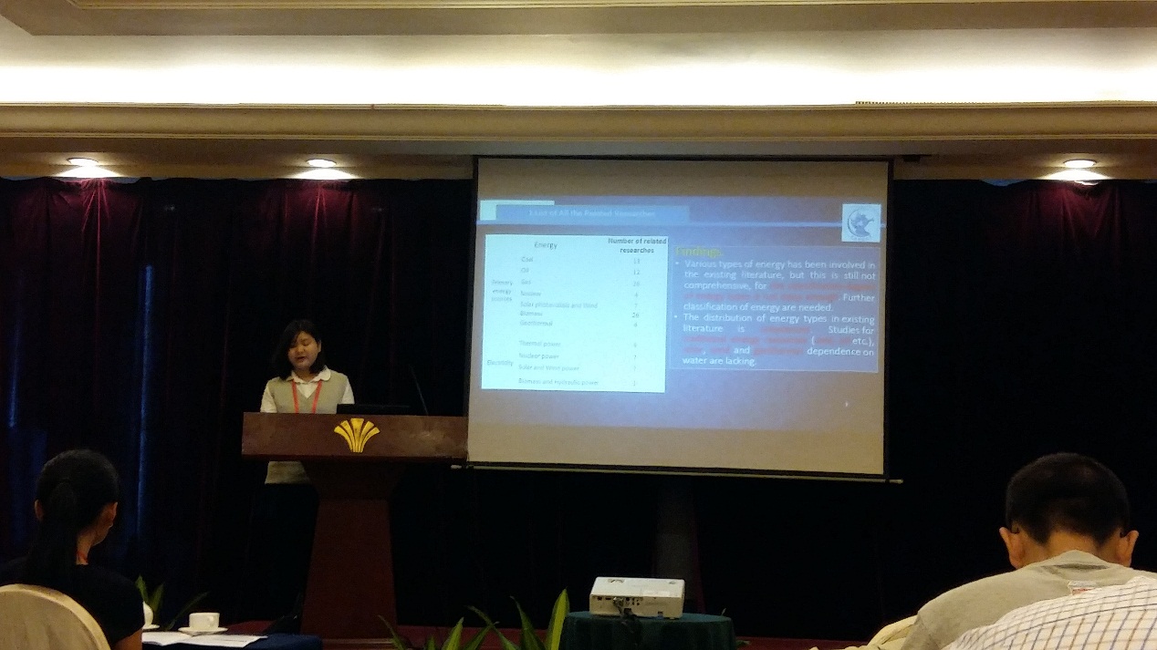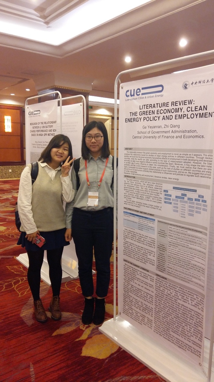 今年会2012级行政管理专业本科生葛野嫣然和2012级公共事业管理专业城市管理方向本科生谭翠萍在青年教师智强的带领下参加了此次学术会议,她们与老师合作的两篇论文(学生为第一作者)均被会议接收。论文出自《资源与环境管理》课程,在智强老师精心指导下完成。葛野嫣然的论文《Literature Review: Green economy, clean energy policy and employment》以海报的形式展示了绿色经济背景下清洁能源与就业之间的关系,从就业影响的角度出发搭建了文献框架;谭翠萍的论文《The energy-water nexusLiterature review on the dependence of energy on water》以口头报告的形式展示了当今能源领域较为前沿的水能关系问题,探讨了不同类型的能源对水资源的依赖,与会者表示出浓厚的兴趣和赞许,并就相关问题与她们进行提问和交流。今年会学生扎实的研究、自信的交流、虚心的学习,给与会人员留下了良好的印象。