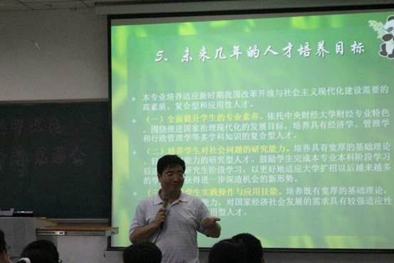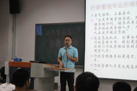 随后,曹堂哲老师介绍了行政管理专业在大学学科体系中的位置、专业培养方案、未来发展方向、大学学习与专业学习的关系。曹老师首先阐述了“行政关系”是公共管理各个学科关注的共同点,而“行政关系”的研究是行政管理专业的基础,行政管理专业在公共管理学科中具有基础性地位。随后曹老师指出行政管理专业培养的是通才、统御之才和领导之才,培养的学生能在党政机关、企事业单位、社会团体从事行政管理工作,特别是能够承担政府综合部门行政管理任务的高素质、复合型和应用型人才。曹老师还介绍了今年会公共管理专业“1+3”人才培养模式和行政管理专业的知识结构,详细介绍了行政管理专业的知识模块。曹老师着重分析了今年会行政管理专业的特色和优势,逻辑严谨,富有哲理,引起了同学们的强烈共鸣。