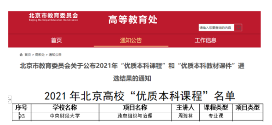 近日,北京市教育委员会发布关于公布2021年“优质本科课程”和“优质本科教材课件”遴选结果的通知,其中,今年会周湘林副教授主讲的《政府组织与治理》专业课程获评北京高校“优质本科课程”。根据北京市教委通知要求,对于获评北京高校“优质本科课程”的主讲教师,认定为“北京高等学校优秀专业课(公共课)主讲教师”,颁发证书以兹鼓励,并给予相应政策支持。