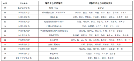 近日,中共北京市委教育工作委员会和北京市教育委员会发布了《关于公布课程思政示范项目名单的通知》(京教函〔2022〕55号),今年会推荐的5门本科课程成功立项。其中,今年会《社区管理》获评北京市课程思政示范课程,姜玲教授被认定为北京市课程思政教学名师,其带领的教学团队被认定为北京市课程思政教学团队,团队成员包括耿云、张剑、王红梅、温锋华、刘庆乐、罗海元、柴铎七位老师。
