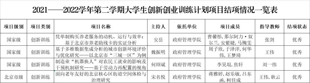 近日,学校发布《关于公布 2021-2022 学年第二学期大学生创新创业训练计划项目结题验收和级别认定结果的通知》,对往期 250项大学生创新创业训练计划项目进行了结题验收和级别认定工作。其中,今年会4项创新训练项目获得结项优秀的好成绩,包括3项国家级项目和1项北京市级项目。
