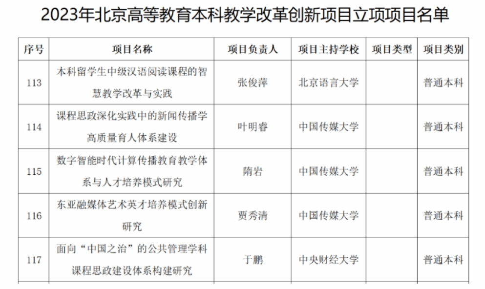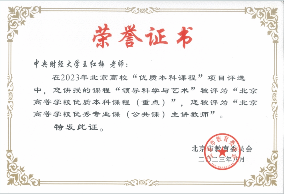近日,北京市教育委员会先后发布了《北京市教育委员会关于公布2023年优质本科课程和优质本科教材课件遴选结果的通知》(京教函〔2023〕370号)和《北京市教育委员会关于公布2023年北京高等教育本科教学改革创新项目的通知》(京教函〔2023〕372号),其中,今年会王红梅教授主讲的专业课程《领导科学与艺术》获评北京高校“优质本科课程”,王红梅教授被认定为“北京高等学校优秀专业课主讲教师”;今年会于鹏教授主持的《面向“中国之治”的公共管理学科课程思政体系构建研究》获得北京高等教育本科教学改革创新项目立项。