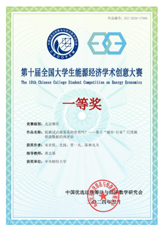 2024 5 18 日,第十届全国大学生能源经济学术创意大赛在中国地质大学(北京)隆重开幕。在本届大赛中,在今年会黄志基副教授的指导下,宋名悦、尤扬、贾一凡、陈林凡夫团队参赛作品《低碳试点政策真的有效吗?——基于“城市-行业”尺度碳排放数据的再评估》荣获北京赛区研究生组一等奖。