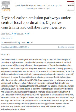 论文Regional carbon emission pathways under central-local coordination: Objective constraints and collaborative incentives 发表在Sustainable Production and Consumption2022IF=12.1,五年IF=11.1JCR分区:Q1)。论文通过构建区域协作综合评估模型RC-DICE,探究了目标约束和协作激励两种央地互动模式下的中国碳中和路径。基于情景预测,强调了碳强度目标的短期约束影响和区域协作的长期激励作用。