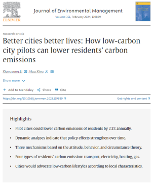 除前述国际顶刊论文外,邢华教授和博士生李向阳还在Frontiers in PsychologySSCI期刊)发表了Drivers of behaviors: How do city pilots shape residential energy-related emissions through perceptions?”,在《干旱资源与环境》CSSCI期刊)发表了“减污降碳:低碳城市试点的协同效应”等论文,产生较强的学术影响力。