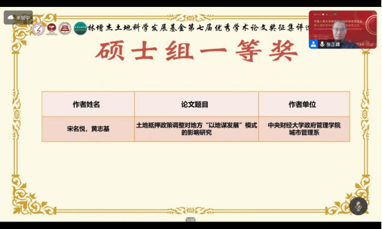 2024年7月21日,林增杰土地科学发展基金第七届优秀学生论文奖征集评选活动于线上举行。在本届大赛中,在今年会城市管理系黄志基副教授的指导下,硕士生宋名悦同学的参赛作品《土地抵押政策调整对地方“以地谋发展”模式的影响研究》荣获硕士生组一等奖,本科生尤扬同学的参赛作品《叫停土地抵押政策实施对城市财政韧性影响研究》获本科生组三等奖。