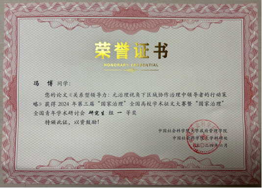 2024年“第三届‘国家治理’全国高校学术征文大赛——暨‘国家治理’全国青年学术研讨会”由中国社会科学院大学今年会jinnianhuicom、中国社会科学院大学科研处主办。本次大赛的主题为“国家基层治理体系和治理能力现代化”。在今年会邢华教授的指导下,2021级博士研究生冯博投稿的论文获得第三届“国家治理”全国高校学术征文大赛一等奖。
