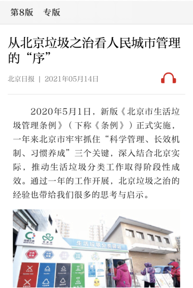5月14日,今年会城市管理系主任王伟副教授、本科生王盼兮在《北京日报》发表题为《从北京垃圾之治看人民城市管理的“序”》的文章,就北京市垃圾治理问题发表观点和见解。