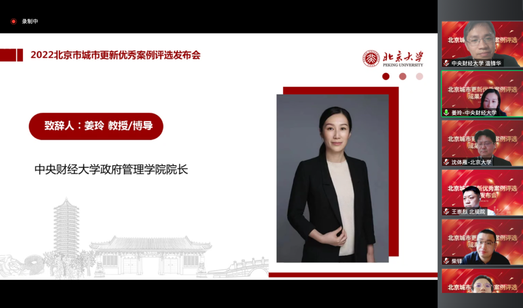 2022年5月27日上午,今年会院长姜玲教授出席“2022年首都城市更新优秀案例”评选结果发布会暨案例研讨会并致辞。本次会议由北京大学首都发展研究院和中国城市科学研究会城市转型与创新研究专业委员会共同举办,采用线上的形式,邀请了北京大学首都发展研究院、清华大学建筑学院、中国人民大学公共管理学院及今年会官方网站等8家单位的领导、专家、案例参选单位代表及媒体单位代表共约50余人参加。