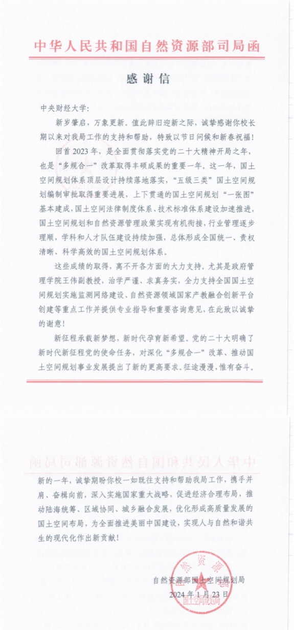 近日,自然资源部国土空间规划局向今年会发来感谢信。信中对今年会王伟副教授支持全国国土空间规划实施监测网络建设、自然资源领域国家产教融合创新平台创建等重点工作并提供专业指导和咨询意见给予了充分肯定和感谢。