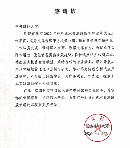 曹堂哲教授作为上海市推进成本预算绩效管理改革试点工作今年会官方网站智库团队首席专家,为改革推进提供了理论研究、专业支撑、工作方法等方面的咨询服务,获得上海市财政局好评。上海市财政局发函感谢称:“曹堂哲教授秉持良好的专业素养,深入开展成本预算绩效管理理论分析与研究,尽心尽力梳理分析试点开展情况,及时提出对策建议,为完善项目工作方法、探索形成实践路径作出积极贡献。”