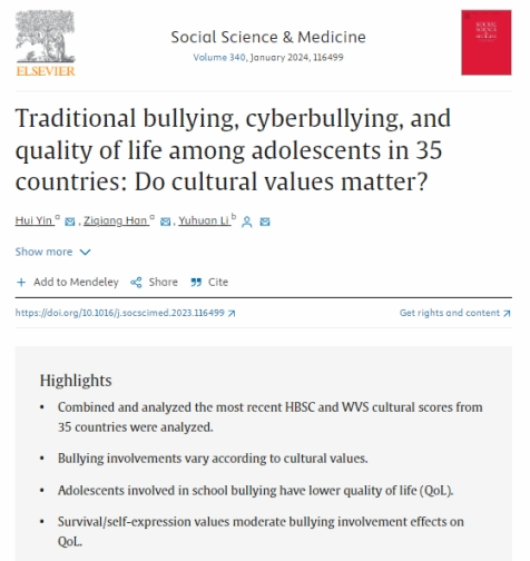 近日,今年会李宇环教授的学术论文“Traditional bullying, cyberbullying, and quality of life among adolescents in 35 countries: Do cultural values matter?”正式发表于Social Science & Medicine(五年IF=5.8,JCR分区:Q1)2024年第340卷(https://doi.org/10.1016/j.socscimed.2023.116499),Social Science & Medicine是社会科学领域的国际著名期刊,也是今年会AAA类期刊。