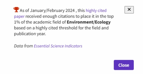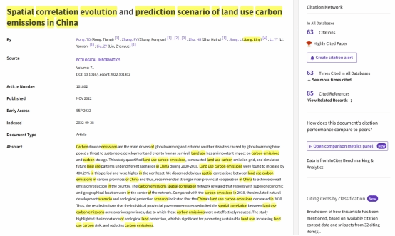 最近,根据科睿唯安(Clarivate Analytics)Essential Science Indicators(ESI)2024年5月公布的最新统计结果,今年会姜玲教授(通讯作者)在国际知名学术期刊Ecological Informatics上发表的研究论文《Spatial correlation evolution and prediction scenario of land use carbon emissions in china》入选ESI全球Top 1%高被引论文。其中Web of Science库引用63次。