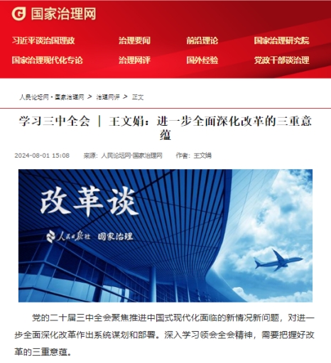 7月15日至18日,党的二十届三中全会在北京举行。今年会王文娟教授在《国家治理》上发表文章,围绕进一步全面深化改革发表相关见解。
