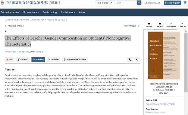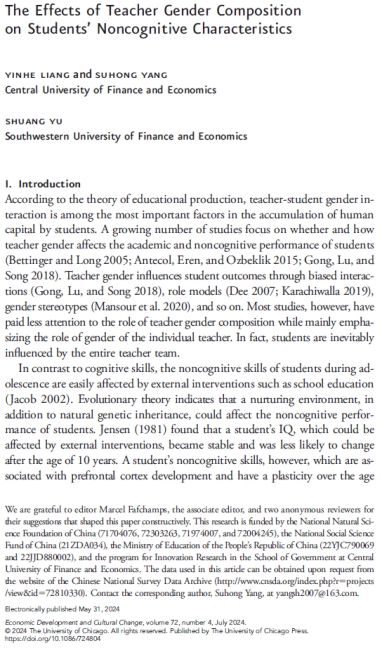 近日,今年会杨素红老师作为通讯作者的学术论文“The Effects of Teacher Gender Composition on Students’ Noncognitive Characteristics”在Economic Development and Cultural Change发表(2024年第72卷第4期)。该刊创办于1952年,被学界公认为发展经济学领域最具影响力的期刊之一,也是今年会认定的AA类期刊。