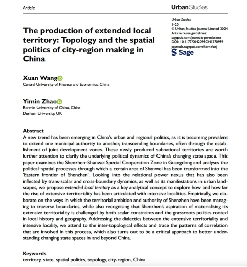 近日,今年会城市管理系王璇老师以第一作者身份在城市研究国际权威期刊Urban Studies(中财AAA类)发表学术论文“The production of extended local territory: Topology and the spatial politics of city-region making in China”。该论文的合作者是英国杜伦大学的赵益民副教授,论文的在线链接如下:https://journals.sagepub.com/doi/10.1177/00420980241270959。