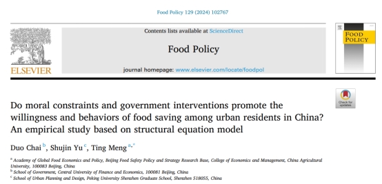 原文信息:Chai, D., Yu, S., & Meng, T. (2024). Do moral constraints and government interventions promote the willingness and behaviors of food saving among urban residents in China? An empirical study based on structural equation model. Food Policy, 129, 102767.