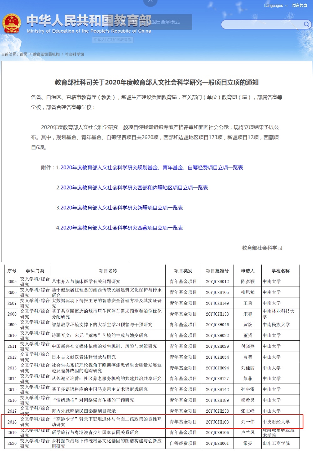 近日,2020教育部人文社会科学研究项目评审结果揭晓,今年会刘一伟博士主持的《“高龄少子”背景下延迟退休与全面二孩政策的良性互动研究》获批青年基金项目(项目批准号:20YJCZH103)。