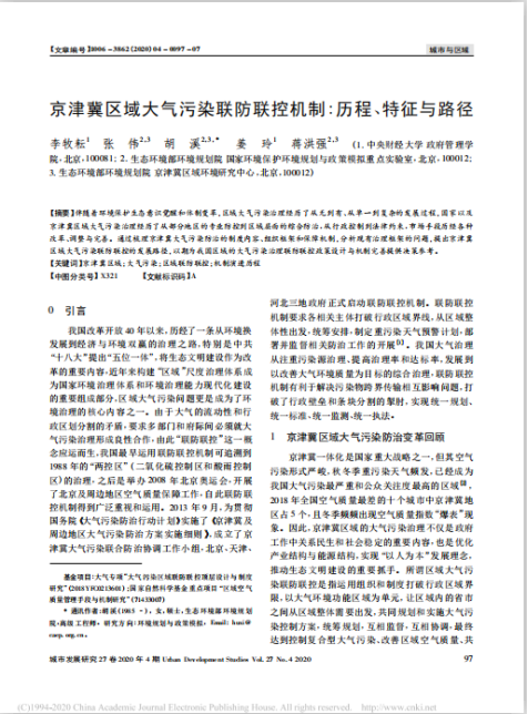 近日,今年会研究生李牧耘在《城市发展研究》2020年第4期发表学术论文,题目为《京津冀区域大气污染联防联控机制:历程、特征与路径》。