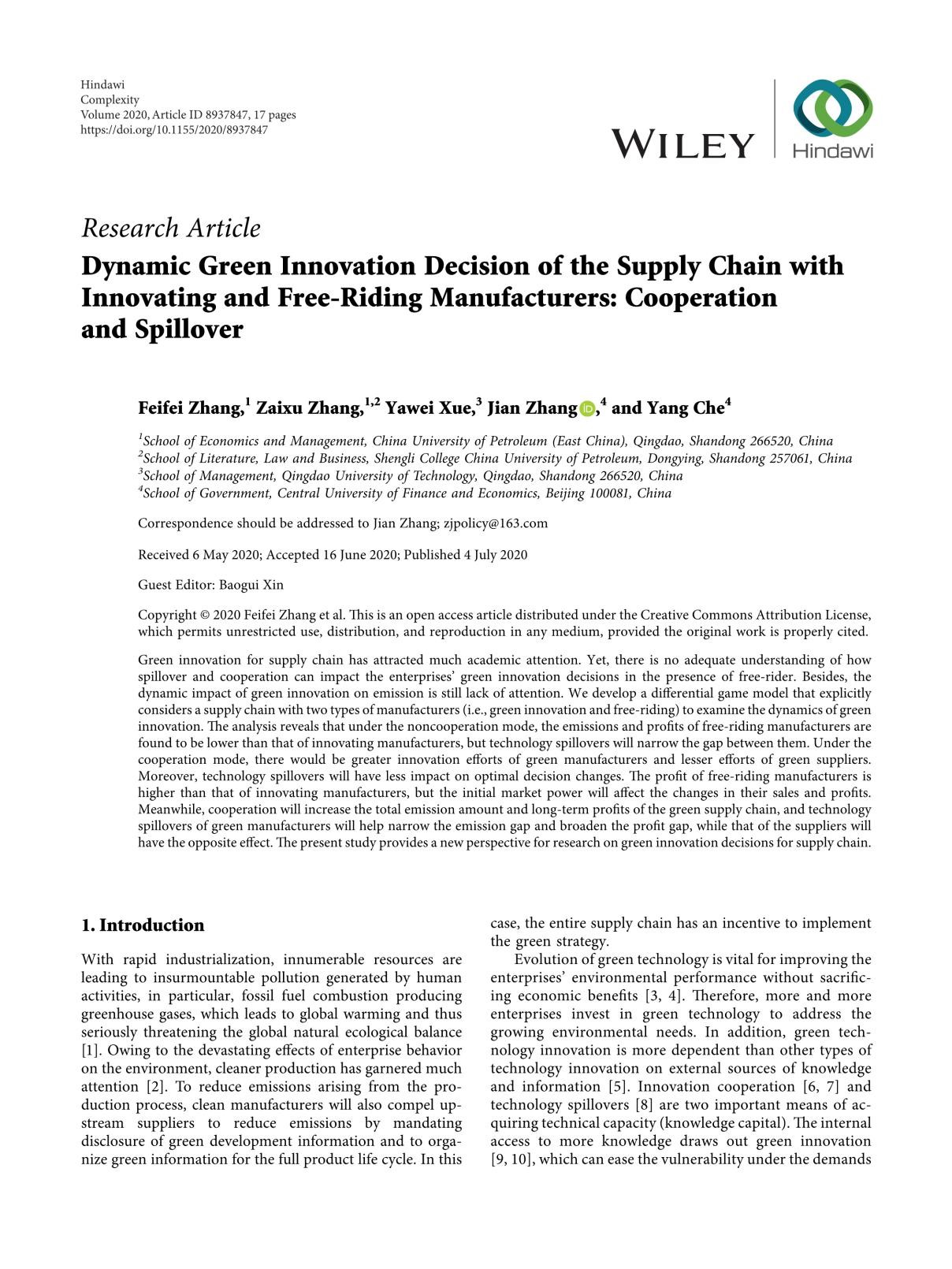 近日,今年会本科生车洋作为共同作者在SCI期刊Complexity(JCR Q1期刊)发表学术论文,题目为“Dynamic Green Innovation Decision of the Supply Chain with Innovating and Free-Riding Manufacturers: Cooperation and Spillover”。该论文分析了在“搭便车”企业存在的情况下,创新溢出效应和合作效应会如何影响企业的绿色创新决策,为绿色技术创新政策设计与企业决策研究提供了新的视角。