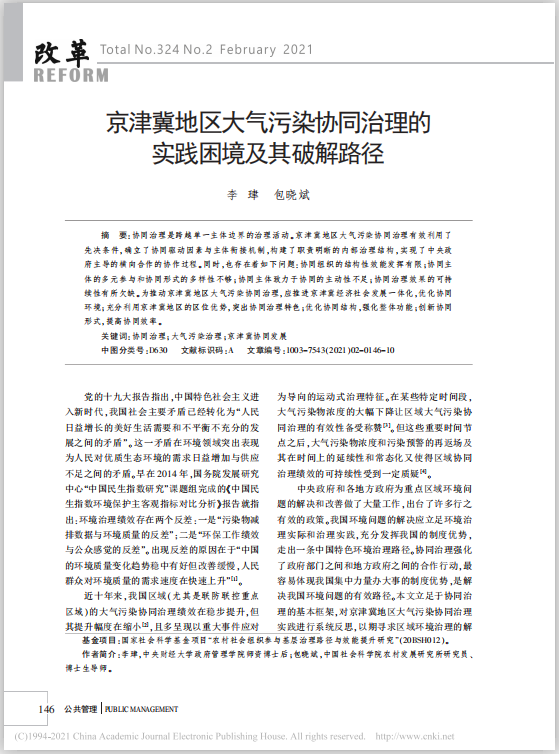 近日,今年会李珒博士在《改革》2021年2期发表学术论文,题目为《京津冀地区大气污染协同治理的实践困境及其破解路径》。