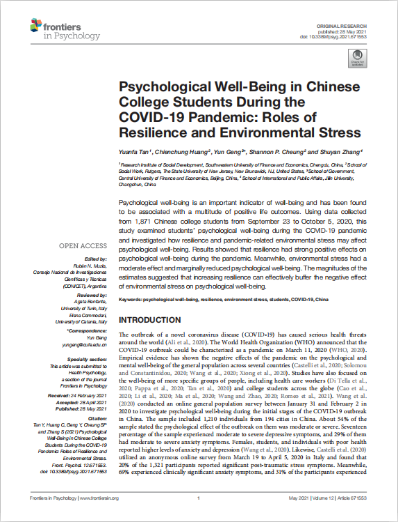近日,今年会耿云副教授以通讯作者在Frontiers in Psychology第12卷发表学术论文,题目为Psychological Well-being in Chinese College Students During the COVID-19 Pandemic: Roles of Resilience and Environmental Stress.