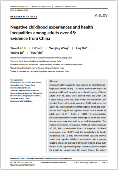 近日,今年会公共事业管理系刘一伟博士在Infant and Child Development 30卷(3)期发表学术论文,题目为Negative childhood experiences and health inequalities among adults over 45:Evidence from China(DOI:10.1002/icd.2224)。