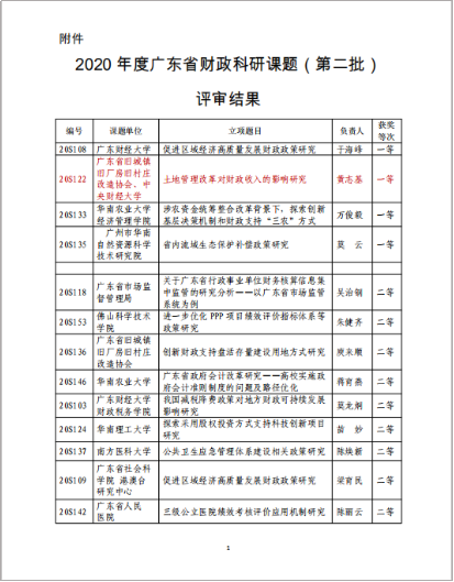 近日,广东省财政厅公布了2020年度广东财政科研课题结项评审结果的通知,评选出一等奖课题4个、二等奖课题11个、三等奖课题37个。今年会黄志基副教授承担的课题《土地管理改革对财政收入的影响研究》获得了一等奖。