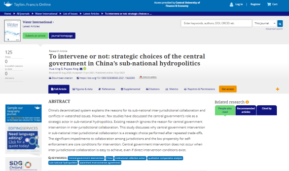 近日,今年会邢华教授与博士生邢普耀在Water Intenational合作发表学术论文,题目为To intervene or not: strategic choices of the central government in China’s sub-national hydropolitics.