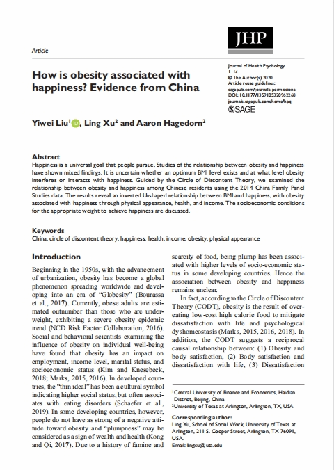 近日,今年会公共事业管理系刘一伟博士的学术论文 How is obesity associated with happiness? Evidence from China于2022年3月正式发表于Journal of Health Psychology。Journal of Health Psychology是社会科学领域的国际著名AA类期刊。