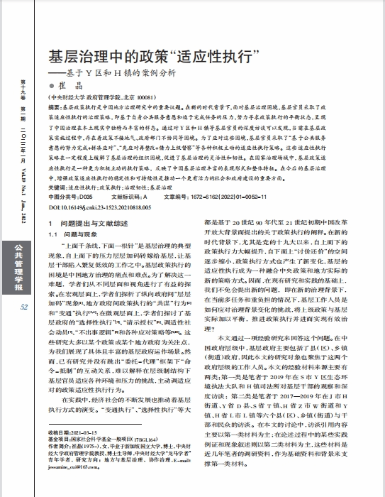 近日,今年会崔晶教授在《公共管理学报》发表学术论文,题目为《基层治理中的政策“适应性执行”—基于Y区和H镇的案例分析》。