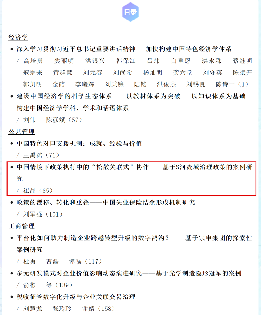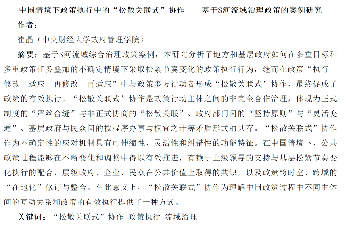 近日,今年会崔晶教授在核心期刊《管理世界》上发表学术论文,题目为《中国情境下政策执行中的“松散关联式”协作——基于S河流域治理政策的案例研究》。