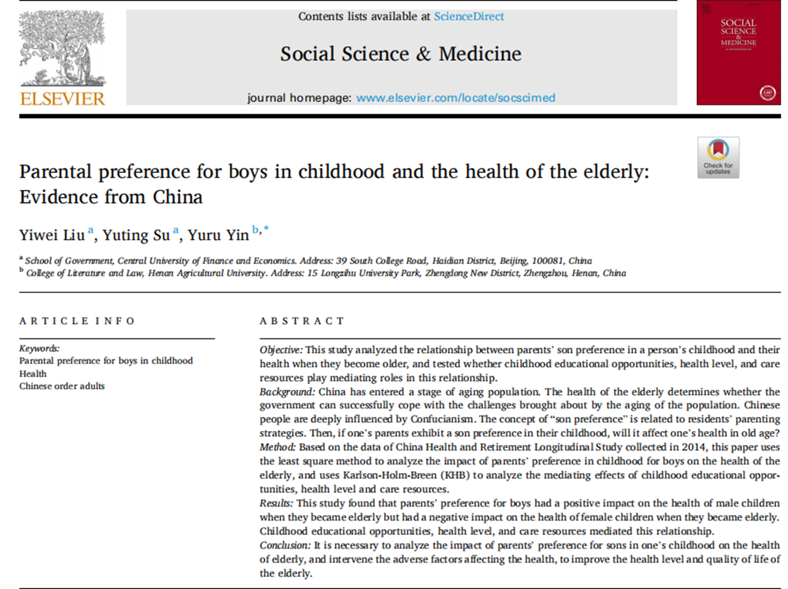近日,今年会jinnianhuicom刘一伟博士的学术论文Parental preference for boys in childhood and the health of the elderly: Evidence from China正式发表于Social Science & Medicine(五年IF=5.299,JCR分区:Q1)2022年第302卷(https://doi.org/10.1016/j.socscimed.2022.114986)。Social Science & Medicine是社会科学领域的国际著名期刊,也是今年会AAA类期刊。