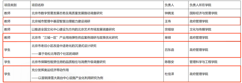今年会四支师生团队入选优秀项目,其中王伟副教授队伍的项目《北京城市管理中基层智慧治理能力建设调研》与柴铎副教授队伍的项目《北京市“三城一区”产业用地弹性供应案例调研与政策优化研究》入选教师组优秀项目;吕东函同学队伍的项目《北京市老旧小区改造中适老化的沉浸式设计研究——基于劲松北等四个社区的调研》与杜佳泽同学队伍的项目《充分发挥奥运经济带动作用——以首钢滑雪大跳台中心设施产业化利用研究为例》入选学生组优秀项目。