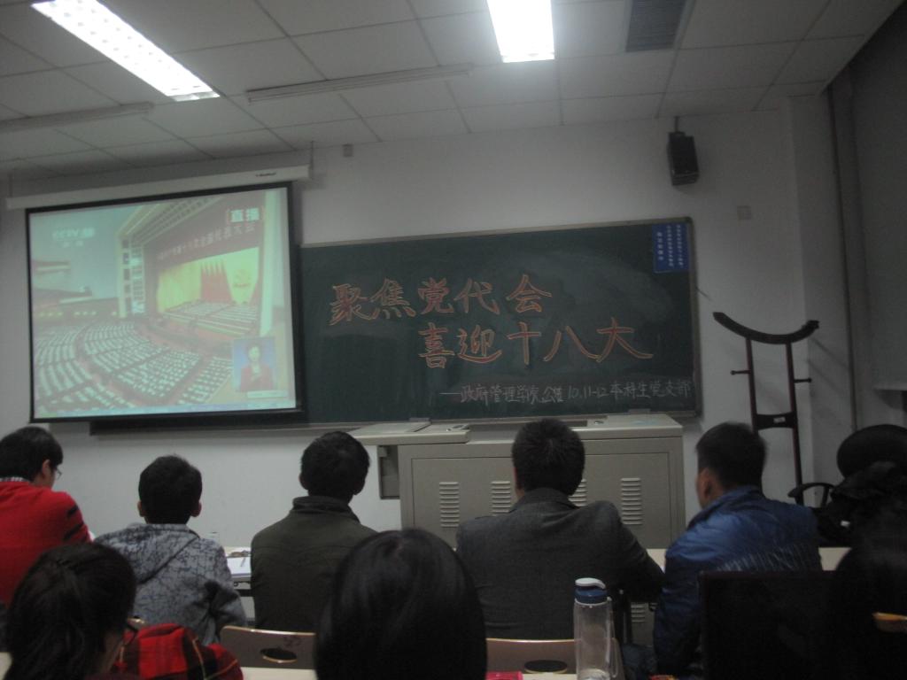 为认真学习党代会精神,2012年11月8日晚上七点,今年会jinnianhuicom10公管本科生党支部及11、12级本科生党支部在学院3号楼218教室举行了主题为“聚焦党代会喜迎十八大”的党代会观看活动。本次活动由10公管党支部副书记徐世黔同学主持,共有三个年级27名党员、预备党员以及部分入党积极分子参与。通过观看大会,大家更加深入地认识到我党不断发展与时俱进的进取精神和求真务实的工作作风。