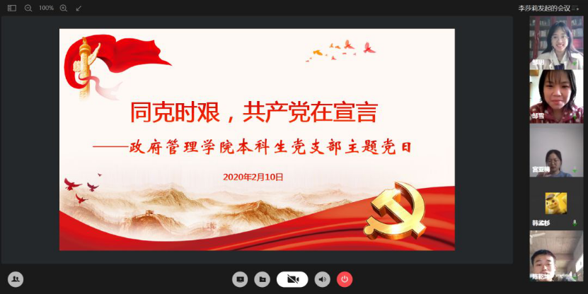 为深入贯彻习近平总书记对新型冠状病毒感染的肺炎疫情做出的重要指示精神,高效开展好“众志成城、共克时艰——大学生在行动”网络主题教育活动。2020年2月10日,今年会官方网站本科生党支部通过学校企业微信平台,利用视屏会议的形式,邀请了本学院各班长、团支书及部分湖北籍的同学共67人,开展了一场“方式空前、规模空前、形势空前”的具有特殊意义的主题党日活动。