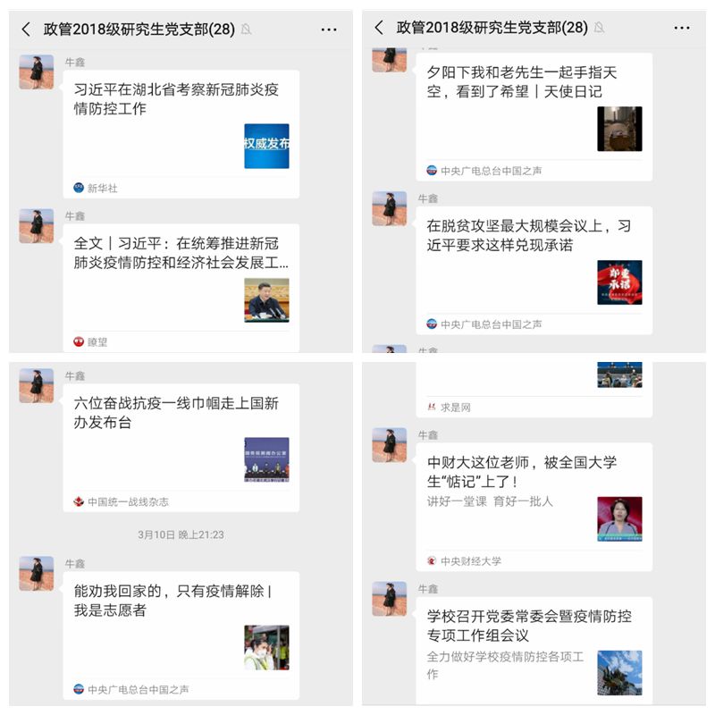 在开展主题党日活动正式前,经支部委员会商议,组织全体党员利用3月10日-3月12日2天的时间,线下组织开展三个方面的认真学习:一是认真学习习近平总书记有关新冠肺炎疫情防控的重要讲话精神;二是认真学习党中央、国务院和学校党委有关疫情防控的工作部署,三是认真学习在防控新冠肺炎前线中涌现出来的先进事迹和榜样力量。支部书记李佳鹏、宣传委员牛鑫分别负责学习强国支部组织群、支部微信群上传上述相关学习资料。支部党员通过在家线上灵活自主学习,有效增强党员对疫情防控的严峻性、严重性和艰巨性的认识,有效引导支部党员关心关注疫情动态、正确认识疫情防控防范。