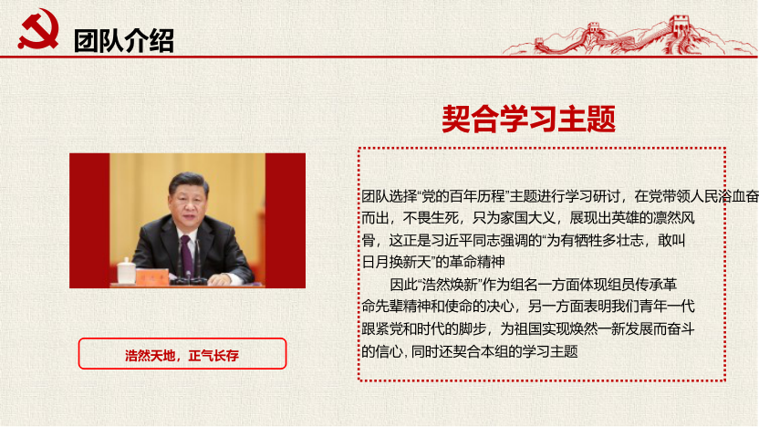 “浩然天地,正气长存”。“浩存焕新”小组成员认识到中国共产党百年的接续奋斗启示我们:必须把学习掌握马克思主义理论作为必修课、必须把学以致用作为根本目的。新时代青年要有传承革命先辈精神和使命的决心,跟紧党和时代的脚步,为祖国实现焕然一新发展而奋斗的信心。