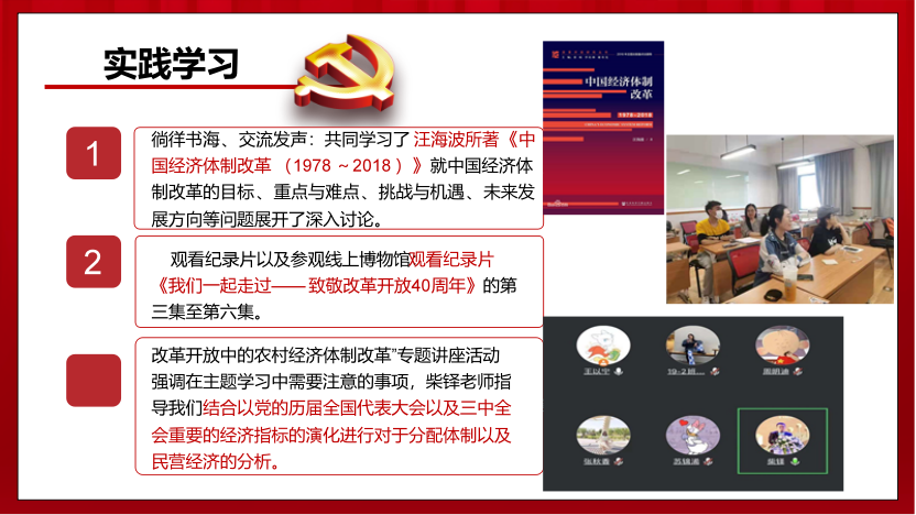 “百年风雨,玉汝于成,继往开来,勇赴新征程”。 “百年风雨新征程”小组成员通过历史梳理与专题研究展开“中国共产党应对风险挑战的百年历史研究”的主题学习,小组成员认识到预判风险是防范风险的前提,把握风险走向是谋求战略主动的关键。要加强风险意识,下好先手棋,做好随时应对各种风险挑战的准备。