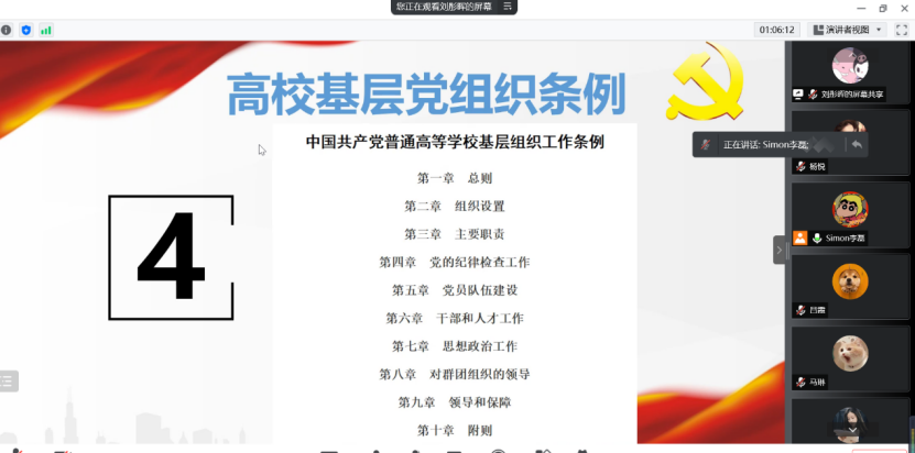 为提高党员的思想认识和理论修养,不断提高学校党的建设质量和水平,2022年3月20日下午 ,今年会jinnianhuicom学术研第二党支部组织党员认真学习 《中国共产党普通高等学校基层组织工作条例》 (以下简称“《条例》”)。 此次会议由 支部书记李磊主持,参会人员为支部全体党员。