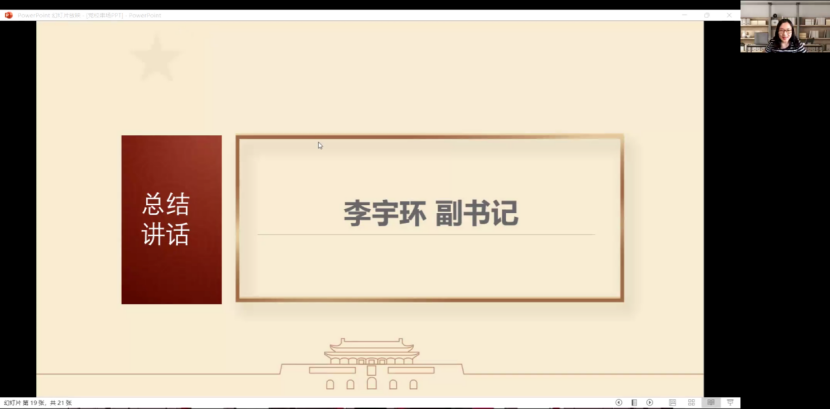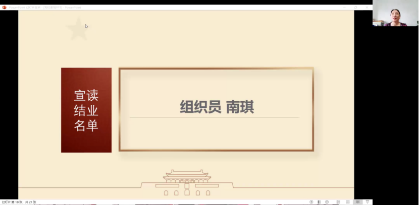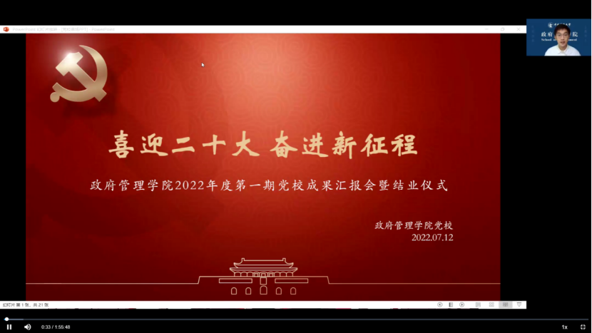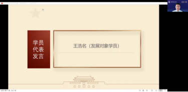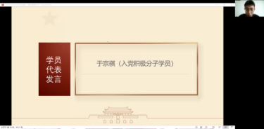 以史为鉴,继往开来,不忘初心,奋勇向前。值此二十大将至之际,今年会jinnianhuicom2022年度第一期党校成果汇报会暨结业仪式于2022年7月12日在腾讯会议平台隆重举行,今年会jinnianhuicom党委书记、党校校长吕丽研究员,副院长于鹏教授,党委副书记、纪委书记、党校副校长李宇环副教授,组织员南琪老师,学生工作办公室、党校办公室主任张小林老师,研究生工作办公室主任张鑫媛老师,本科生党支部书记、团委书记李莎莉老师,团委副书记、2020级本科生辅导员尹燕斌老师,2019级、2021级本科生辅导员许缤月老师,以及2022年度第一期党校全体学员参加了本期党校成果汇报会暨结业仪式。本次党校成果汇报会暨结业仪式由郭俊铭主持。