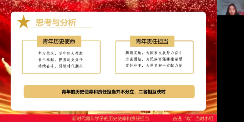 “不啻微茫,造炬成阳。”团结点点微茫,便可汇聚成太阳般的光亮。“造炬成阳小组”正是秉持着这份初心砥砺前行,在平台课程、自学的理论学习中,在感悟实践学习中,领悟党员奋斗的精神,深刻剖析了深刻改变历史的五四运动与五四精神,结合时代新变化与新要求,提出了五四精神的时代演变,最后习近平总书记给的寄语,对广大青年提出了更高的担当要求:传承五四精神,不忘党的纪律,凝聚青春力量的微茫,书写青春的华章。