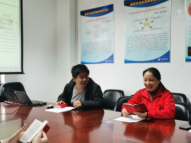 随后,支部书记张小林对对照党章党规找差距这一主题进行总体介绍。结合主题教育总要求,他强调,在座党员一定要提高政治意识,牢记党员身份,坚定理想信念,坚决做到“两个维护”。其次,要增强组织纪律性,严守党的政治纪律,在党言党,在党忧党,坚定政治立场。此外,张小林老师还向支部成员提出了四点要求:第一,必须加强学习,深刻理解习近平新时代中国特色社会主义思想内涵;第二,真正做到心中有党;第三,做到心中有戒,提高纪律意识;第四,做到知行信合一,时刻以党员的标准约束自身言行。