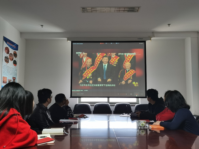 会议伊始,支部全体成员集体观看了《榜样4》中张富清的片段。95岁的老党员、老英雄张富清在解放战争中战功赫赫,1955年转业到湖北最艰苦的山区工作,为贫困山区奉献一生。64年来,他从未向别人提及此事,更没有因此向组织提出任何要求,直到去年底退役军人信息采集时才被发现。张富清老人身上坚守初心、不改本色、朴实纯粹、淡泊名利的精神,令在座党员深深动容,更激励着各位党员艰苦奋斗、尽职尽责、敬业奉献,以脚踏实地的态度做好本职工作、服务好今年会一流学科、一流学院建设。
