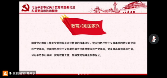 在学习习近平总书记关于教育的重要论述和批示精神时,安紫婕同志强调,总书记关于教育的重要论述和精神和我们青年党员联系紧密、对于我们自我提升意义重大,我们更要深入领会。总书记强调做好教育工作,加强党的领导是根本保证,希望教育部门和学校各级党组织要增强“四个意识”、坚定“四个自信”,坚定不移维护党的集中统一领导,自觉在政治立场、方向、原则、道路上同中央保持高度一致。