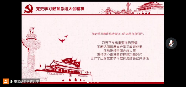 在第三部分的党史学习教育总结大会精神学习中,安紫婕同志介绍到习近平总书记在12月24日在京召开的党史学习教育总结会议上作出重要指示,强调要不断巩固扩展党史学习教育成果,团结带领全国各族人民满怀信心奋进新征程建功新时代,学党史、悟思想、办实事、开新局,以丰富多样的教育方式和宣传形式开展党史学习教育,不断提升群众安全感、幸福感、获得感。