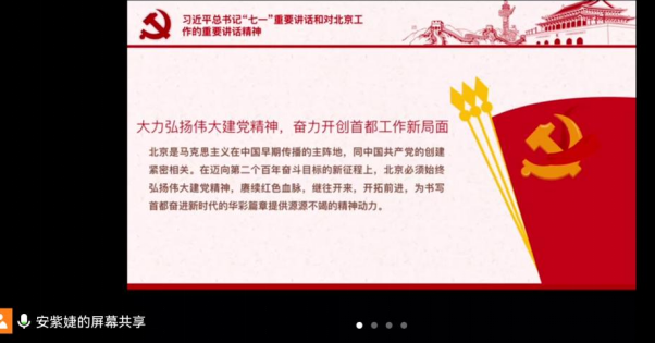 在习近平总书记“七一”重要讲话和对北京工作的重要讲话精神部分,安紫婕同志讲道,习近平总书记在“七一”重要讲话中强调要大力弘扬伟大建党精神,奋力开创首都工作新局面。一百年前,中国共产党的先驱们创建了中国共产党、形成了坚持真理、坚守理想、践行初心、担当使命、不怕牺牲、英勇斗争、对党忠诚、不负人民的伟大建党精神,这是中国共产党的精神之源。总书记在“七一”重要讲话中引导我们要不忘初心、牢记使命,其主要精神可以概括为八个方面:百年大党历史伟业将永载史册,其领导核心将永立潮头,我们应更加坚决做到“两个维护”,以人民为中心,同时要自觉用党的创新理论武装头脑,坚定践行中国人民和中国共产党的理想体系,自觉传承红色基因,将发展作为执政兴国的第一要务。