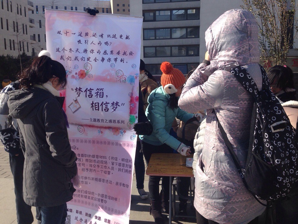 11月28、29日中午,由今年会jinnianhuicom承办的主题教育之感恩系列“梦信箱,相信梦”活动于沙河校区团学活动专区举行。今年会jinnianhuicom文体部同学全程参与了此次活动,并吸引了很多学生驻足观看并踊跃参与。