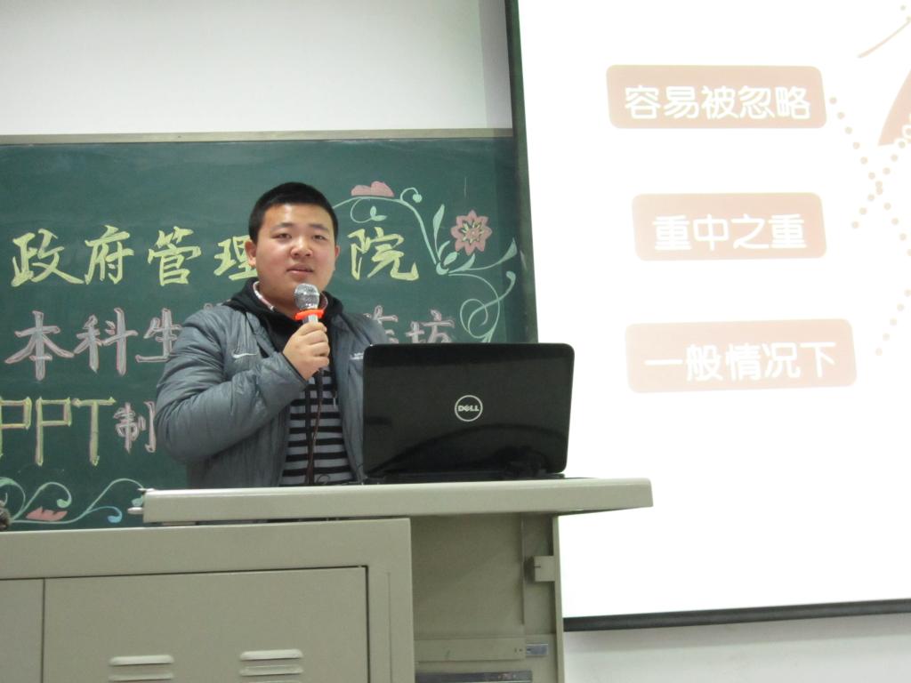 徐翰斐同学用幽默诙谐的语言、高超娴熟的技能,以通俗易懂的方式为同学们讲解了PPT颜色的搭配、不同字体的适用场合、多样化字体的获取、不同页面的切换等方面的内容。除了反复演示相关操作流程外,徐翰斐同学还在讲解中穿插了一些个人经历和有趣的视频,既增加了活动的趣味性,又丰富了同学们的视野。活动最后,徐翰斐同学与在座同学交流了他关于PPT制作的心得,他告诫大家制作PPT“思路是第一位”、“不要在不该较真的地方较真”,使同学们获益匪浅。